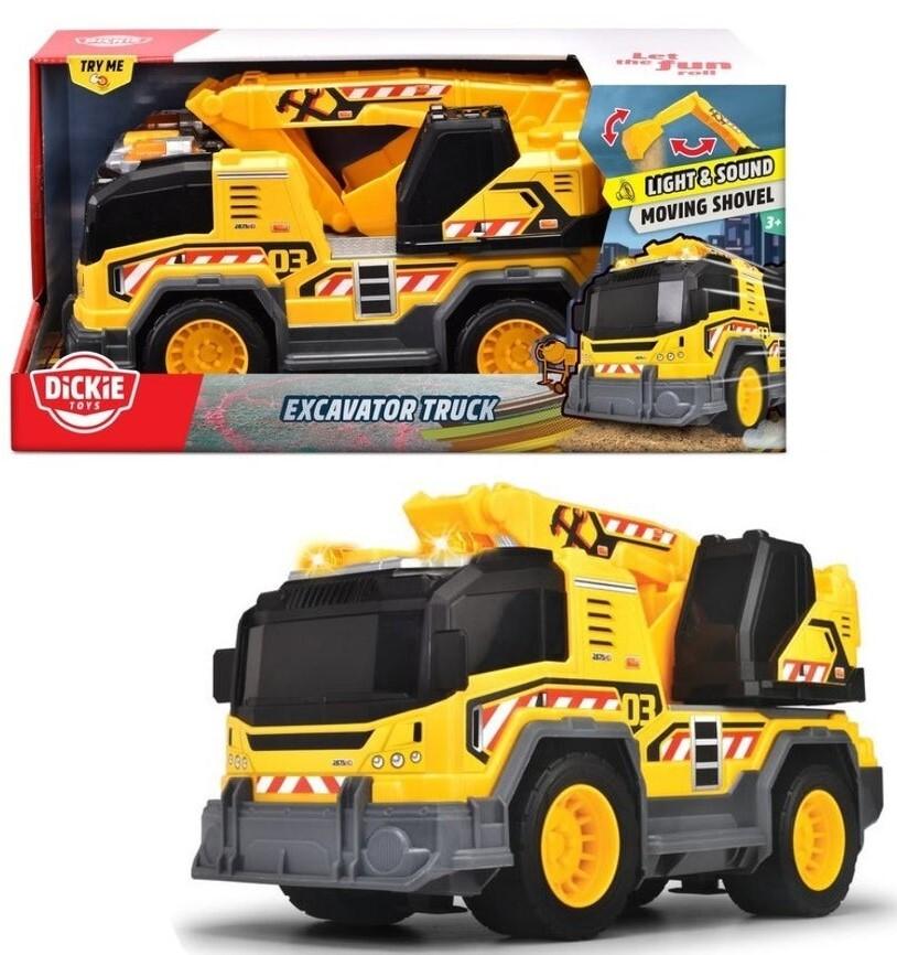 *Dickie: Excavator Truck*Meet the Dickie Excavator Truck Toy, the ultimate companion for your little construction enthusiast! This eye-catching excavator features a realistic design and movable parts, including a fully functional arm and bucket for digging and scooping. Crafted from durable, non-toxic materials, it’s built to withstand rugged play both indoors and outdoors.With its vibrant colors and detailed construction features, the Dickie Excavator inspires imaginative adventures and encourages creative play. Perfect for the sandbox or the backyard, this excavator is ready to take on any project and dig up loads of fun!*Features:** Freewheel,* Light,* Sound,* Excavator on platfrom rotates 360 degree,* Fold out manually,* Size: 30cm*Suitable for Ages 3+*_Required: 2× AA Batteries (included)_