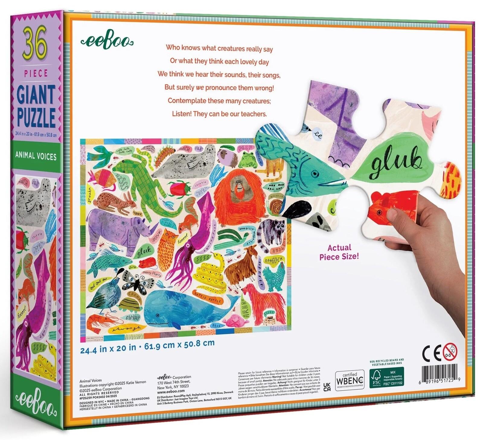 *eeBoo: Giant Animal Voices – Puzzle (36pc Jigsaw)*Artist Katie Vernon’s playful collection of creatures from every corner of the world adds a silly soundtrack. Children and their parents will enjoy sharing in the noisy merriment, and perhaps find it leads to a conversation about how other species make themselves heard, and why.*Contents:** 36 sturdy, dustless, double-coated puzzle pieces that snap together with ease*Specifications:** Develops Patience, Confidence, and Large Motor Skills.* Sustainably Sourced: Made with recycled board and printed on FSC®-certified paper using vegetable-based inks.* Completed Puzzle: 24.5" x 20"* Box Size: 12" x 9.82" x 2.5"
