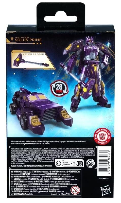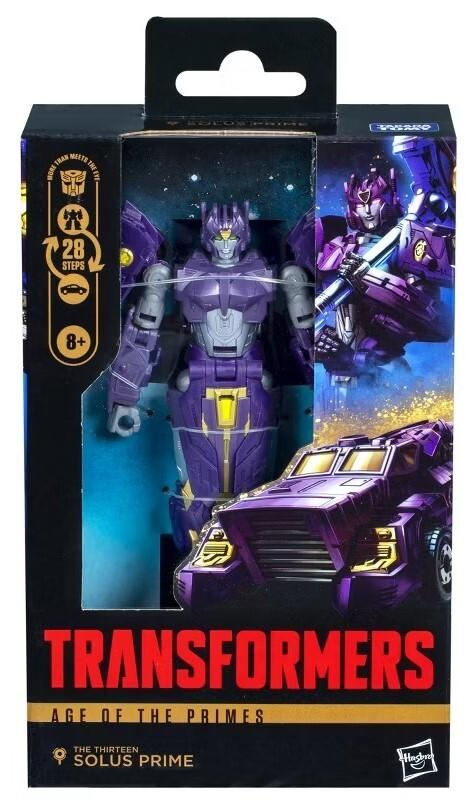 *Transformers Age of the Primes: Deluxe – Solus Prime*Unite your favorite characters from across the world of Transformers robots into your collection with the Transformers Age of the Primes Deluxe Class The Thirteen Solus Prime action figure! This 5.5-inch The Thirteen Solus Prime action figure converts between robot and Cybertronian armored car modes in 28 steps. Includes a Forge of Solus Prime Artifact hammer accessory that attaches to the figure. The Thirteen Solus Prime figure is inspired by the character from the Transformers universe and features articulated head, arms, and legs for awesome action poses.Transformers: Age of the Primes opens up the world of the Primes, the very first bots in Transformers mythology, a pantheon of Thirteen beings, each with a unique ability and personality. Every battle, every bot, and every power in the Transformers universe can be traced back to one of The Thirteen. Collect and combine different Transformers figures to create your ideal Age of the Primes lineup. TRANSFORMERS and HASBRO and all related trademarks and logos are trademarks of Hasbro, Inc.*Features:** This 5.5-inch (14 cm) Solus Prime action figure features deco and detail inspiration from the Transformers universe* Transformers action figure converts from robot toy to Cybertronian armored car toy in 28 steps* The Thirteen Solus Prime Transformers figure comes with a Forge of Solus Prime Artifact hammer accessory* Transformers action figures feature articulated heads, arms, and legs for action poses* The Thirteen Solus Prime action figure toy makes a great collectible figure gift for any Transformers fan* The Thirteen Solus Prime is the creator Prime with the ability to forge almost any device* The Thirteen Primes are the very first bots in Transformers mythology, a pantheon of beings each with a unique ability and personality. Every battle, bot, and power in the Transformers universe can be traced back to them*Suitable for Ages 8+*