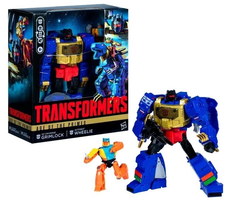*Transformers Age of the Primes: Leader – Grimlock & Wheelie*Unite your favorite characters from across the world of Transformers robots into your collection with the Transformers Age of the Primes Leader Class G2 Universe Grimlock action figure! This 7.5-inch G2 Universe Grimlock action figure converts between robot and tank modes in 22 steps. Gear up for battle with the included cannon blaster accessory.The G2 Universe Grimlock figure is inspired by the character from the Transformers universe and features articulated head, arms, and legs for awesome action poses. Transformers: Age of the Primes opens up the world of the Primes, the very first bots in Transformers mythology, a pantheon of Thirteen beings, each with a unique ability and personality. Every battle, every bot, and every power in the Transformers universe can be traced back to one of The Thirteen. Collect and combine different characters to create your ideal Age of the Primes lineup.*Features:** This 19-cm (7.5 inch) G2 Universe Grimlock action figure toy features deco and detail inspiration from the Transformers universe* Transformers action figure converts from robot toy to dinosaur toy in 22 steps* The G2 Universe Grimlock Transformers figure comes with a cannon blaster accessory that attaches in both modes* Transformers figures feature articulated heads, arms and legs for action poses* The G2 Universe Grimlock action figure toy makes a great collectible figure present for any Transformers fan* The Thirteen Primes are the very first bots in Transformers mythology, a pantheon of beings each with a unique ability and personality. Every battle, bot and power in the Transformers universe can be traced back to them* G2 Universe Grimlock is the powerful leader of the Dinobots and dedicated to the Autobot cause. He is a descendent of Alpha Trion, one of The Thirteen Primes*Suitable for Ages 8+*
