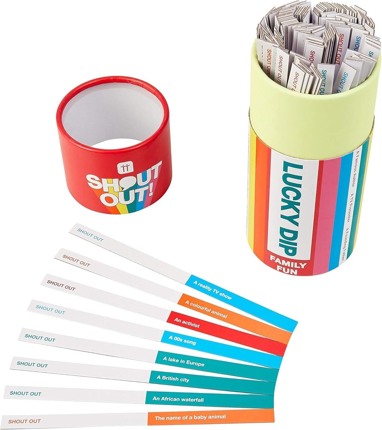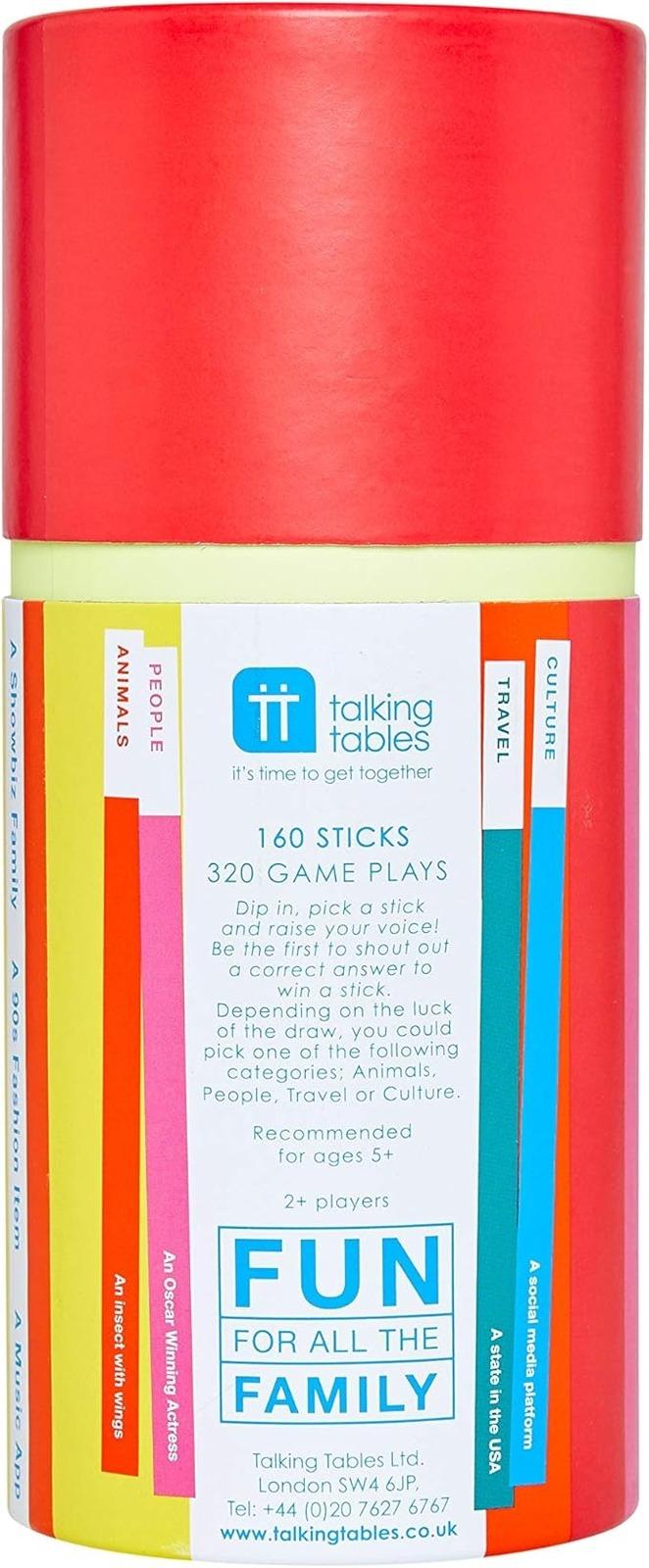 Dip in, pick a stick and raise your voice! Be the first to shout out a correct answer to the question to win a stick.Depending on the luck of the draw, you could pick one of the following family friendly categories; Animals, People, Travel or Culture. The person with the most sticks wins! Contains 160 double sided sticks.*Features:** 2+ Players* Ages 5+