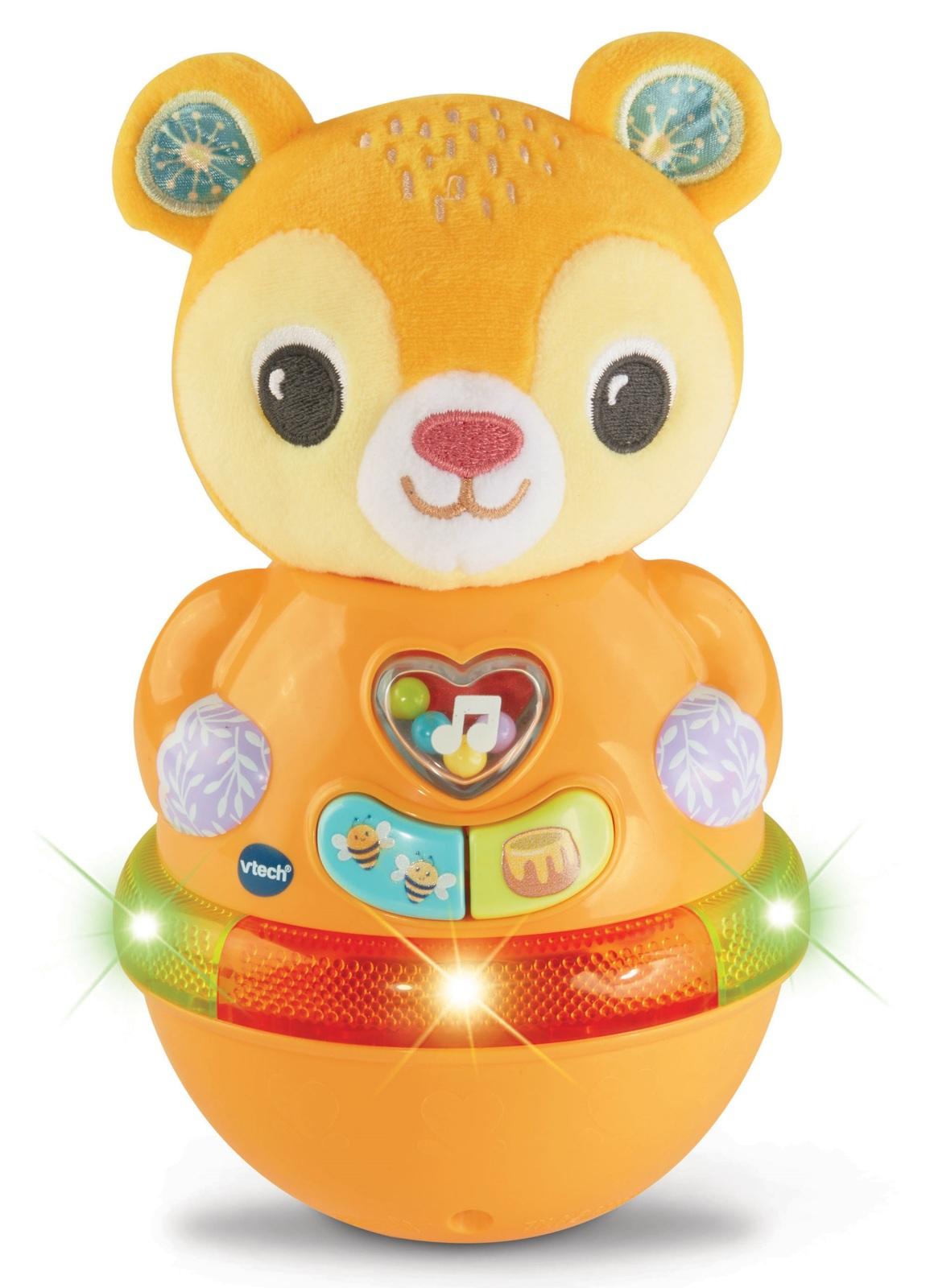 *Let's have some wobbly fun with the Rock and Roll Bear by VTech!*Wobbling bear encourages little one to interact and play. Textured fabrics on the bear introduces tactile awareness. Press the heart button to hear fun phrases, sing-along songs and melodies. The bees and honey pot buttons introduce animals, numbers and fun phrases. Includes 3 sing-along songs & 15 melodies.*Suitable for Ages 6 Months & Up**2 x AAA Battery Required (Not Included)*