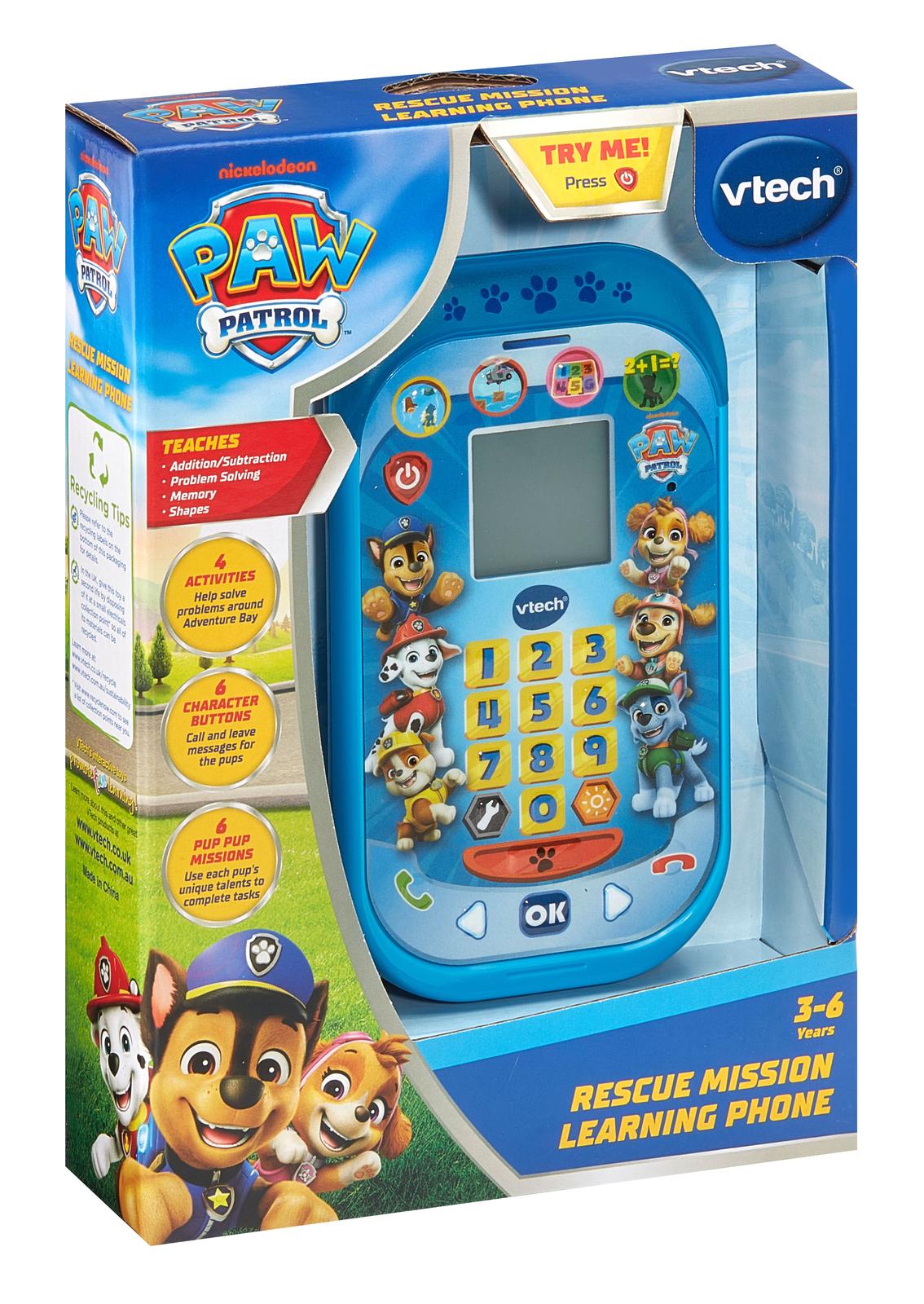 Answer the call of Adventure Bay! Call Marshall, Chase, Skye, Liberty, Rubble and Rocky and pretend to leave messages for them Play four exciting activities and help Marshall avoid obstacles, pick up shape boxes with Skye, remember dance steps with Liberty or help Chase recover gold by solving simple equations.Team up with Ryder to choose the best pup for the job on six Pup Pup Missions Choose from five ringtones to make the phone feel unique Intended for ages 3+ years; requires 2 AA batteries; batteries included for demo purposes only.This pretend-play learning phone toy is great for toddlers and preschoolers to explore math, problem-solving and memory skills; makes an exciting unisex gift for holidays, birthdays or just because.*Suitable for ages 3+ years*