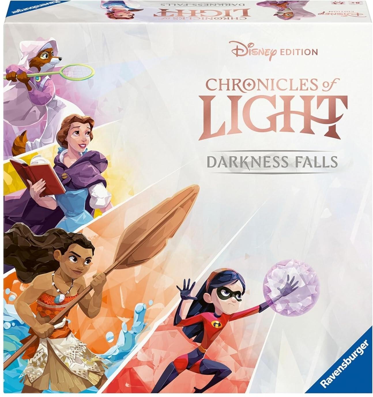 In Chronicles of Light: Darkness Falls (Disney Edition), players work together to form dynamic alliances of Disney and Pixar heroines, including Moana (Moana), Violet (The Incredibles), Maid Marian (Robin Hood) and Belle (Beauty and the Beast).Materialising as radiant crystal versions summoned into the realm, the heroines drive back shadows of infamous Disney villains and restore the Realm of Light. Along the way, the team explores a brand-new illustrated world and encounters familiar characters, items, and creatures on their quests. The game's diverse missions and modular board generate new adventures every time it's played.*Features:** 2–4 Players* Ages 8+