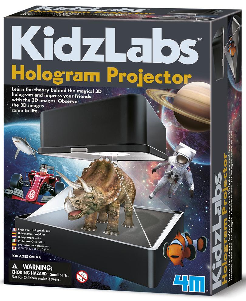 *4M: Kidzlabs – Hologram Projector Kit*Learn the theory behind the magical 3D hologram and impress your friends with the 3D images. Observe the 3D images come to life. Can be used with images on your mobile phone.*Features:** Learn the theory behind the magical 3D hologram and impress your friends with the 3D images.* Contains: the projector components, paper templates and detailed instuctions.* Also required (but not included) are a small crosshead screwdriver, and 2 × 1.5V AAA batteries.*Suitable for ages 8 & up*