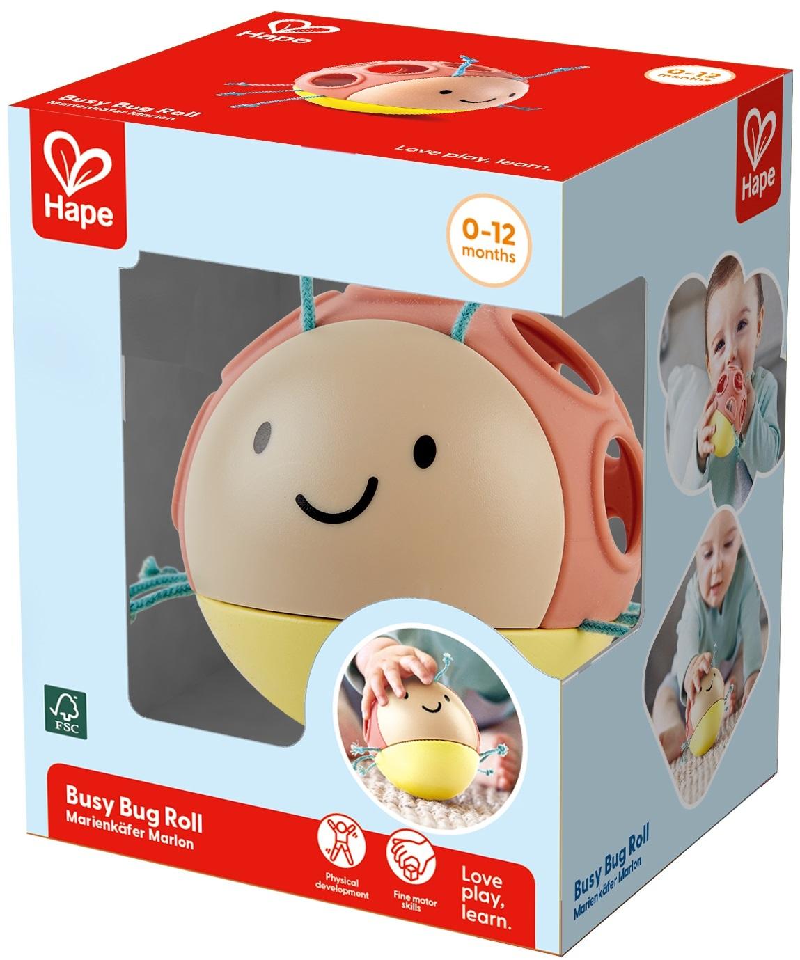 Discover the Busy Bug Roll from the Hape Eltern range for babies from 6 months.This pretty ladybug, made of wood and silicone, stimulates the sense of touch with its different materials and can be easily chewed during dental pain. Thanks to the large holes on its back, it is particularly easy to grip for small children's hands. By shaking the rattle, the child explores the sounds thanks to the small bell located inside and develops fine motor skills.*Features:** Thanks to the large holes on his back, he is particularly good for small hands from 6 months to grab.* Marlon is a multifunctional standing-up figure and ensures many happy hours in the nursery.*Suitable for ages 10 months and up*