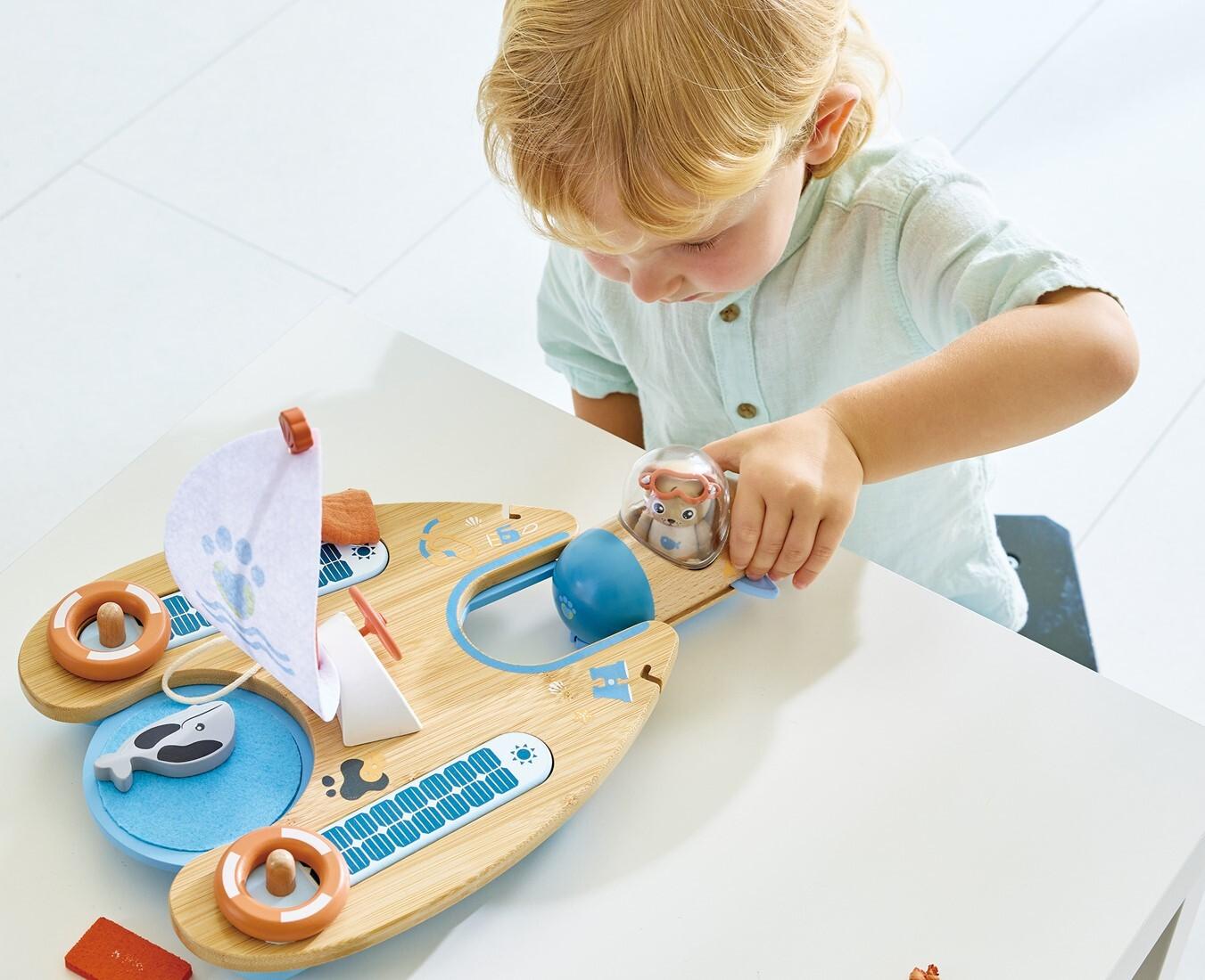 *Hape: Eco Caramaran Rescue*Learn about ocean conservation with Ben's catamaran and his solar powered submarine. Protect the seas by cleaning up the oil spills, rescuing sea creatures, and understanding the importance of removing and preventing pollution.*Features:** Includes 1 boat with storage, 1 openable submarine, 1 figure, 4 sea animals, other accessories and 1 leaflet.* Made from at least 80% renewable materials, including green PE, FSC-certified wood and cotton.* Teach your child about the importance of ocean conservation and how to respond to an oil spill by rescuing sea animals.* Create a play setting around ocean protection with other sets in the Green Planet Explorers range.*Suitable for Ages 3+*