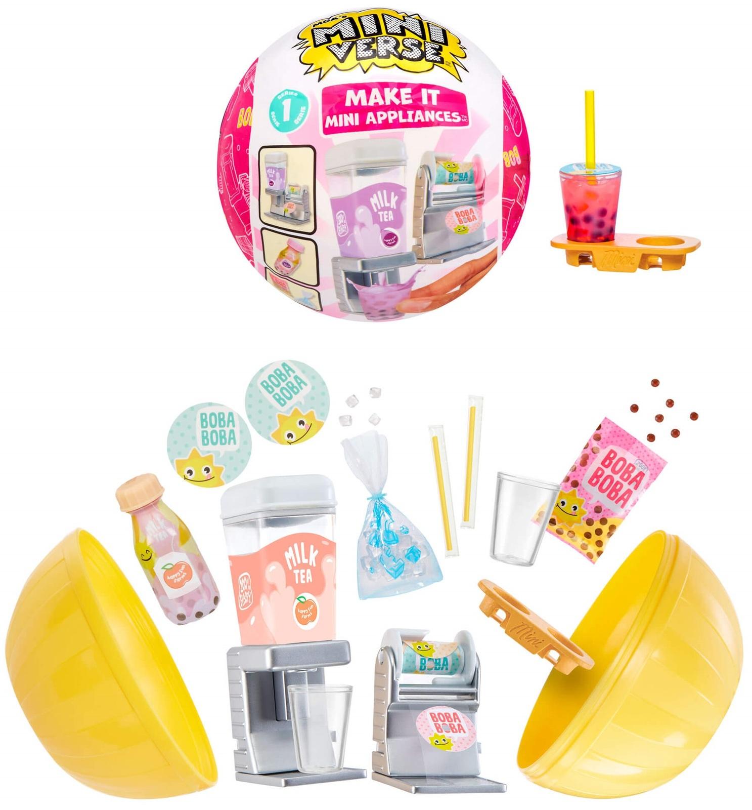 *What do you do when you combine crafting with collectability?*MGA's Miniverse Make It Mini Appliances brings new ways to Make It Mini! All New Mini Appliances that work! Use these appliances to help you make, set, and display your favourite Miniverse Make It Mini Food Beverages. Each ball comes with one real working mini appliance, plus accessories and ingredients to make your mini replica drinks! Each pack includes 1 appliance, 1 bottle of resin, 2 cups to dispense your resin into, and unique accessories for each pack. Each machine has unique real working features that will take your Make It Mini experience to the next level. You'll be able to dispense mini ice cubes from the soda and juice machines. You can seal your boba drink, just like the real thing! And all the appliances dispense resin. Once you have finished dispensing the resin and created your mini drinks, set the replica drinks under any UV light (like the sun) until the resin has hardened. Once it sets, you have a collectible ready to play with or display!Each pack comes with a pair of cupholders (saucers for the Espresso balls) to display your mini drinks. There are 8 MGA's Miniverse Make It Mini Appliances unique styles to collect! The image on the front of the ball will indicate which machine you will be getting, but the SURPRISE is the colour!*Features:** Miniverse is the only mini collectible that you can PREP, SET & DISPLAY.* Each ball comes with realistic mini “ingredients” and accessories.* Use them to make your own mini replicas of your favourite things!* Each package is a SURPRISE so you won't know which mini you have until you unbox it!* Compare the contents of your package with the included collector's guide* Follow the “recipe” card on the back to prep your mini.* Once you've finished creating your mini, set your replica in any UV light* A UV light will harden the resin to complete your replica.* Once it's set, you've got a collectible ready for display!* Set your Miniverse collectible in your capsule that doubles as a display!* Collect them all!*Suitable for ages 8 & up**Please Note:*_Ingredients are NOT edible. Please do not ingest_ _UV lamps are not included in this product. Sold separately_ _Adult supervision is recommended_