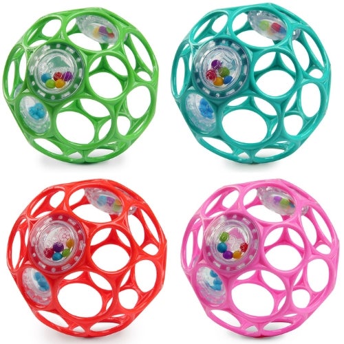 There’s a whole lot of shaking going on with the Oball Rattle™. Much more than your average baby rattle, this adorable rattle is easy to grasp and, it rolls!With 29 finger holes just right for little hands, this award-winning ball rattle is destined to be baby’s favorite. Embedded in the ball are three separate rattles filled with shaker beads that encourage baby to shake the ball and hear fun sounds.The flexible, patented design is easy on little fingers as baby tosses or rattles the ball. With four different color options, you'll want to have plenty of these 4-inch rattles on hand.Suitable for all ages.*Please Note:* This is an assortment. You will receive one Oball 4" Rattle and colours may vary.