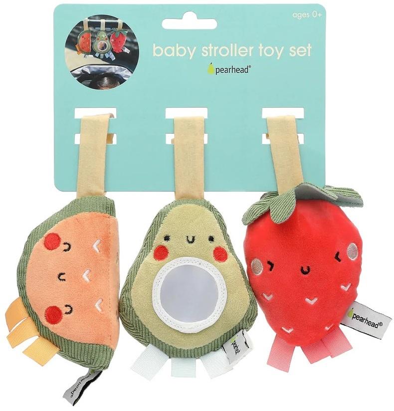 *_Pearhead: Stroller Toy Set of 3 – Fruit_*Your little one has arrived! Now it’s time to make sure you have all the newborn accessories you need to make traveling and being on the go with your baby girl or boy a breeze!This fruit stroller toy set by Pearhead is the perfect baby girl accessory or baby boy accessory for new parents and their little ones – and will quickly become a family favorite!This baby toy set includes three hanging plush toys, each with a hook and loop closure strap.Set includes 1 watermelon, 1 avocado and 1 strawberry with interactive tug tabs, soft plush and corduroy textures, and a mirror to engage your baby’s senses and encourage your baby’s development.This stroller accessory or car seat accessory will make sure baby always has a toy to touch, see and hear. Whether you and your little one are off to daycare, playdates, the park, family visits, dinners or outings this toy set for baby will make getting there, and being there, more fun than ever before! When home, use this set as the perfect baby crib toy set and baby crib accessory set that will look adorable in any baby girl nursery or baby boy nursery.This toy set is the perfect giftable nursery accessory or baby accessory, making it a great gender-neutral baby gift, baby girl gift, baby boy gift, new mom gift, expecting mom gift, pregnancy gift, baby shower gift or addition to your own baby shower registry! Mom, dad and baby will all love the hours of baby play and family bonding they’ll be sure to get with this baby gift set.At Pearhead, we aim to create genuine, quality products to celebrate your special moments in life. We are a family of designers, marketers, and trendsetters bringing products to life that will bring a smile to your face. From concept and design to production and customer service, the Pearhead team works together seamlessly every step of the way. Whether your baby is celebrating their first year of life, you are announcing your pregnancy, or your pup is celebrating his first holiday season, Pearhead is here to share your moment in style.*Features:** Your little baby girl or baby boy will love playing with these adorable on-the-go fruit stroller or baby car seat toys by Pearhead!* These fun and colorful fruit baby stroller toys are the perfect baby travel accessories for parents who want to make sure their little one always has a fun and entertaining play toy while out and about!* These baby toys are the perfect gender-neutral baby gift, baby girl gift, baby boy gift, new mom gift, expecting mom gift, pregnancy gift, baby shower gift or addition to your own baby shower registry!* Each toy measures approximately: 4”W x 4”H x 2.75”D, ages 0+