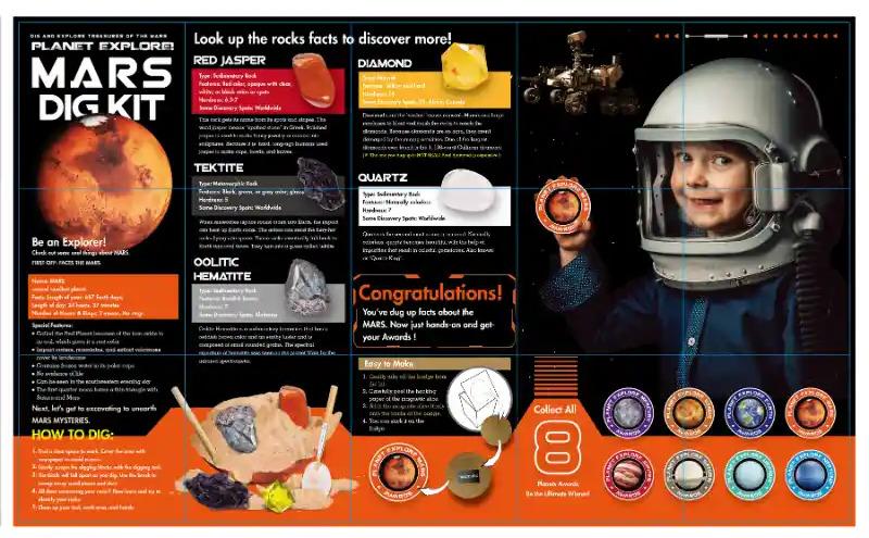 *Planet Explore: Mars Dig Kit*Chip, dig and brush away at the model of planet Mars to reveal the hidden gems inside. A fun excavation kit with lots of opportunity to learn and discuss interesting facts about Mars.According to NASA, Mars – the fourth planet from the Sun – is a dusty, cold, desert world with a very thin atmosphere. This dynamic planet has seasons, polar ice caps, extinct volcanoes, canyons and weather. Includes a brush and chisel*Features:** Learn and discover with Geology and Astronomy* Comes with everything you need to explore* Hours of science fun*Suitable for Ages 6+*