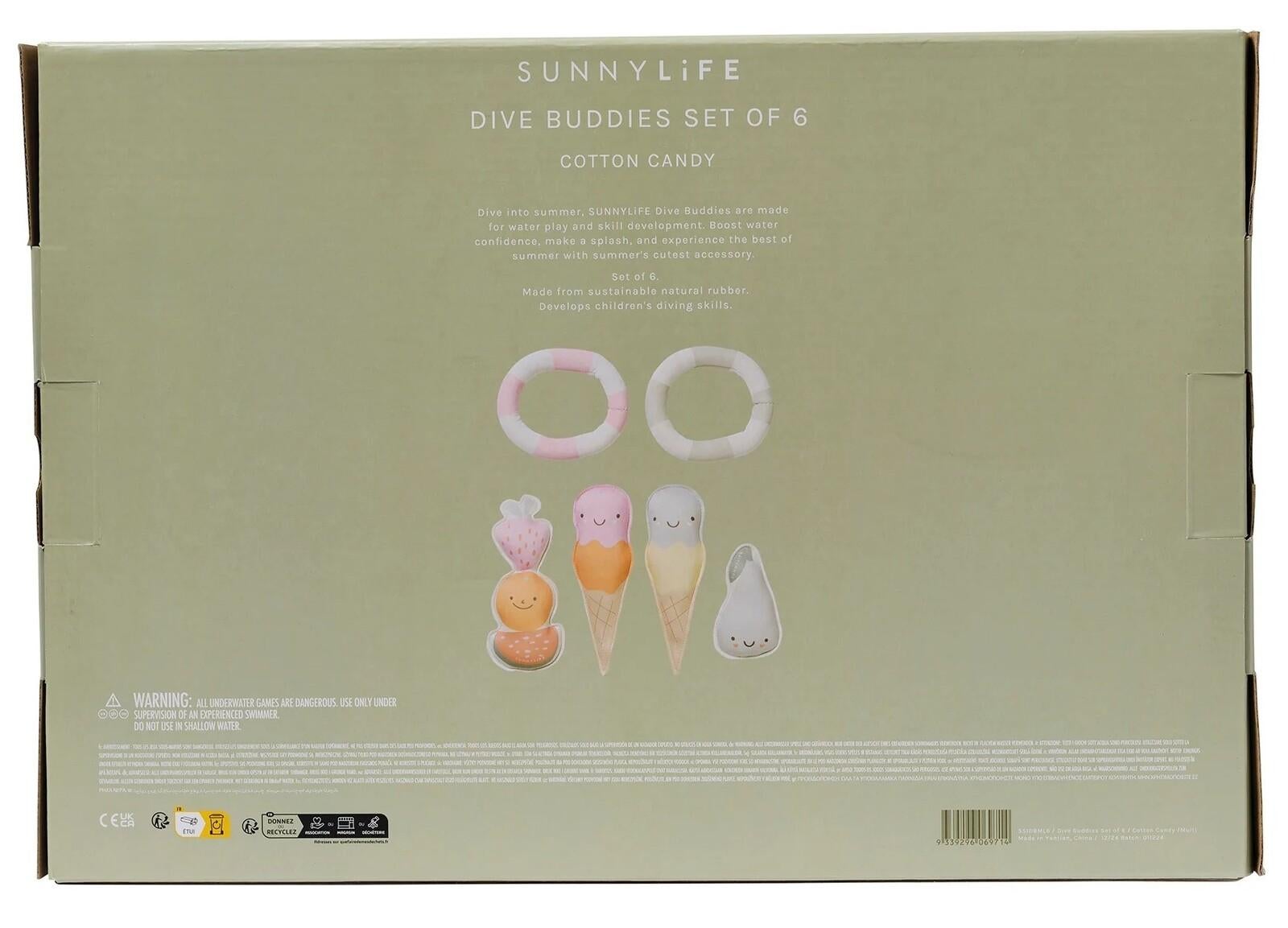 Dive into summer, SUNNYLiFE Dive Buddies are made for water play and skill development. Boost water confidence, make a splash, and experience the best of summer with summer's cutest accessory.*Features:** Set of 6.* Made from sustainable natural rubber.* Develops children's diving skills.*Specifications:** Product Dimensions: L 36 W 35 H 3 cm | L 14.17 W 13.78 H 1.18 in* Package Dimensions: L 44 W 30.7 H 5.2 cm | L 17.32 W 12.09 H 2.05 in* Package Weight: 1.37 kg | 3.02 lbs* Materials: Natural Rubber, Sand, Polyester
