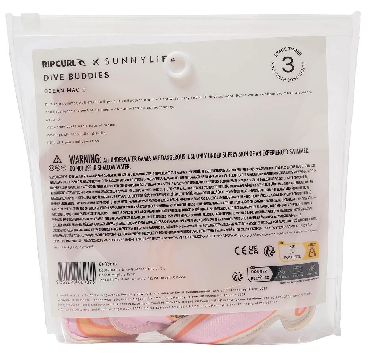 Dive into summer, SUNNYLiFE x Ripcurl Dive Buddies are made for water play and skill development. Boost water confidence, make a splash, and experience the best of summer with summer's cutest accessory.*Features:** Set of 3.* Made from sustainable natural rubber.* Develops children's diving skills.* Official Rip Curl collaboration.*Specifications:** Product Dimensions: L 35.5 W 18 H 2 cm | L 13.98 W 7.09 H 0.79 in* Package Dimensions: L 6 W 26 H 18 cm | L 2.36 W 10.24 H 7.09 in* Materials: Natural Rubber, Sand, Polyester
